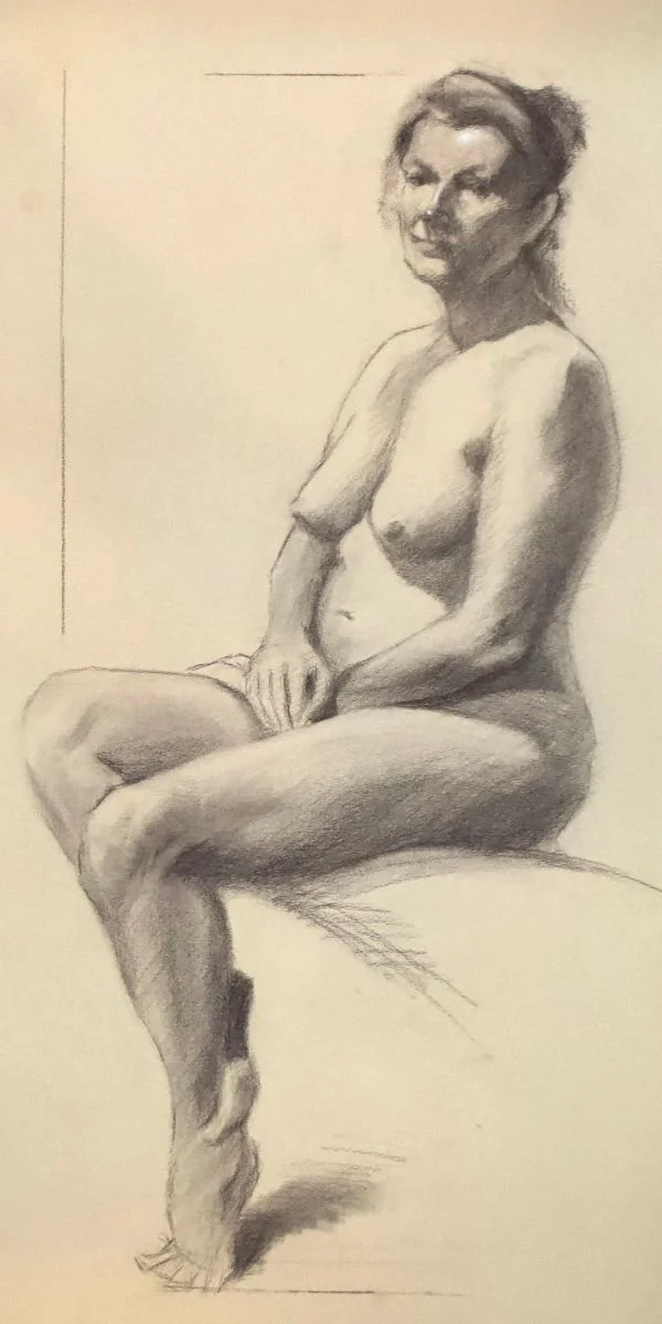 Mainly drawn in charcoal, elegant figures capturing anatomy, posture and gesture